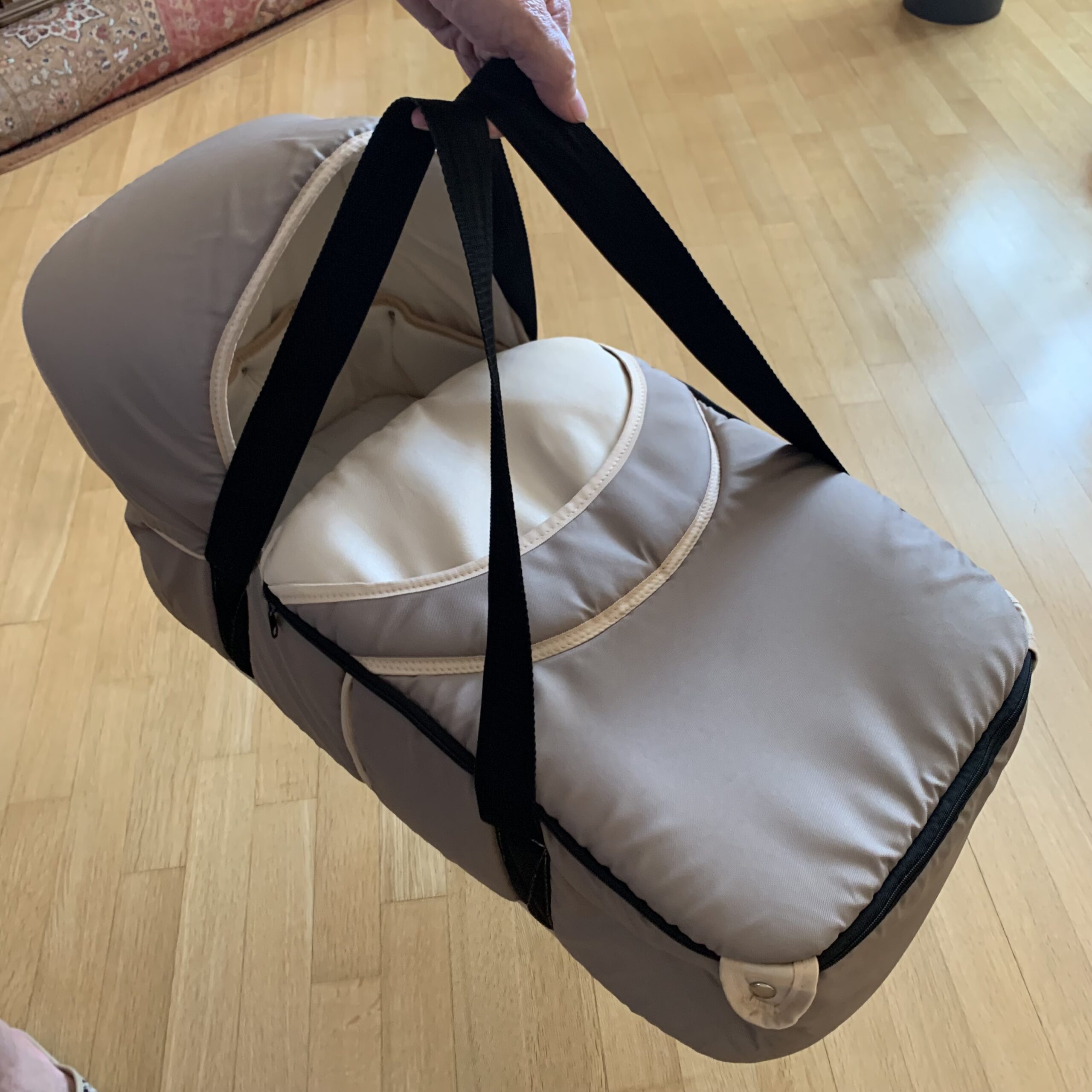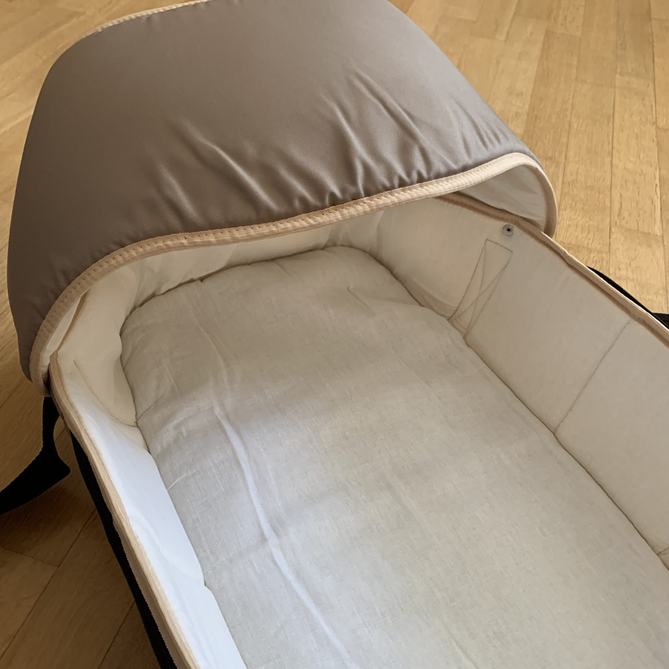 Поверхня не боїться води. Всередині бавовна. Бічні бортики, верхня частина і капюшон м’які, дно люльки тверде з м’яким прошарком.