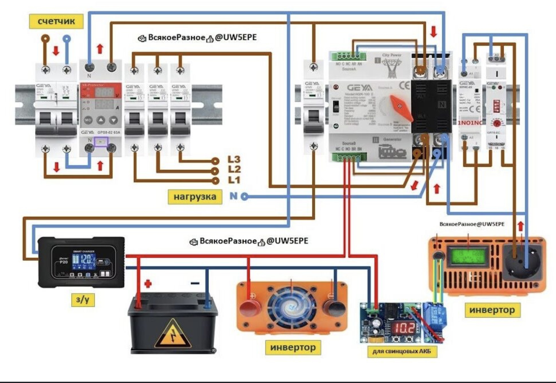 За основу взято компонування із загальним нулем (без другого реле напруги — припускаємо, що воно вже є в електрощиті квартири).