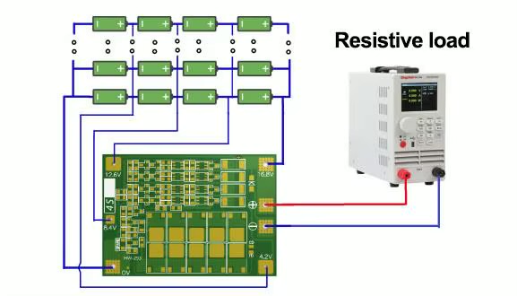 На малюнку нижче показана схема розряду модуля. Акумулятор 4-х рядків. Підключений акумулятор повинен відповідати струму розряду 40 А. Його можна реалізувати шляхом паралельного підключення акумулятора або придбання акумулятора з великим струмом розряду. Наприклад, акумулятор 2000 мАг, розрядка трохи 10C, тоді потрібно лише 4 серії 2, а максимальний струм може досягти струму розряду 40 А, стабільний розряд вимагає 4 рядків 4 і може бути, і необхідно звернути увагу на розсіювання тепла, потужність розряду акумулятора швидко впаде.